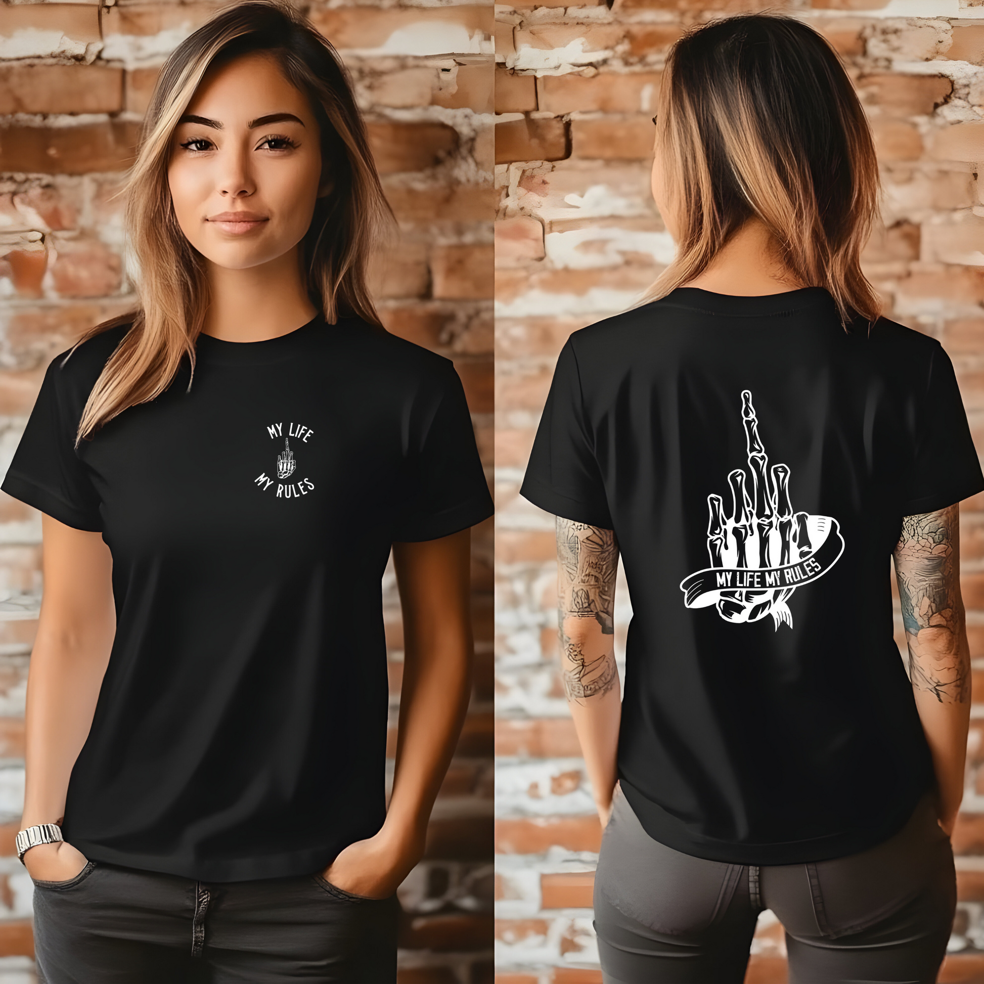 "Unleash your inner rebel with our MY LIFE MY RULES T shirt. Embrace your badass nature and live life on your own terms. Because, let's be real, you're not sorry for being awesome. It's time to rock this shirt and show the world who's boss."